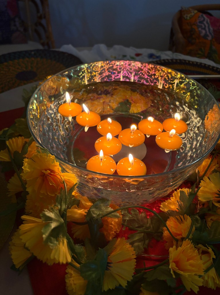 Earlier that weekend, my partner and I had drawn the rangoli together—swirls of color and intention at our doorstep. When the evening arrived, he carefully lit each candle outside, setting them one by one in gentle rows of flame. I, still in my work clothes from the day, lit the diyas as my quiet act of worship.
