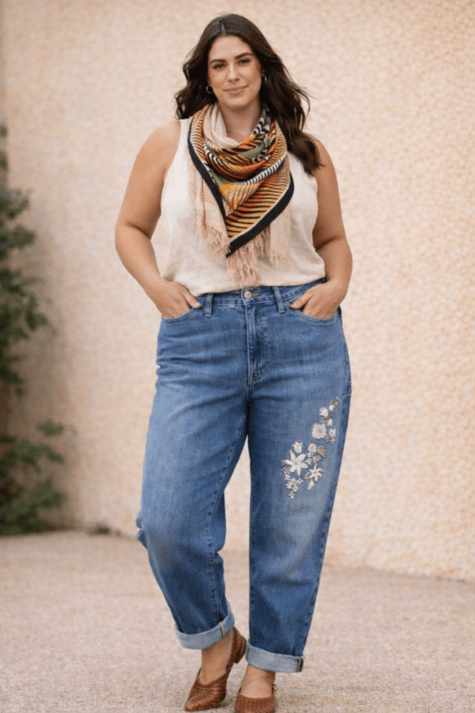 Embroidered American denim — relaxed leadership, adult but expressive.