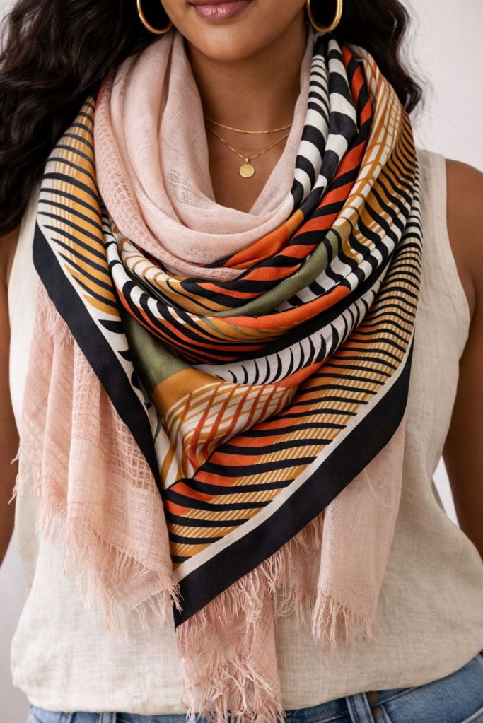 An European silk scarf — structured, well-traveled (like me), layered with memory.